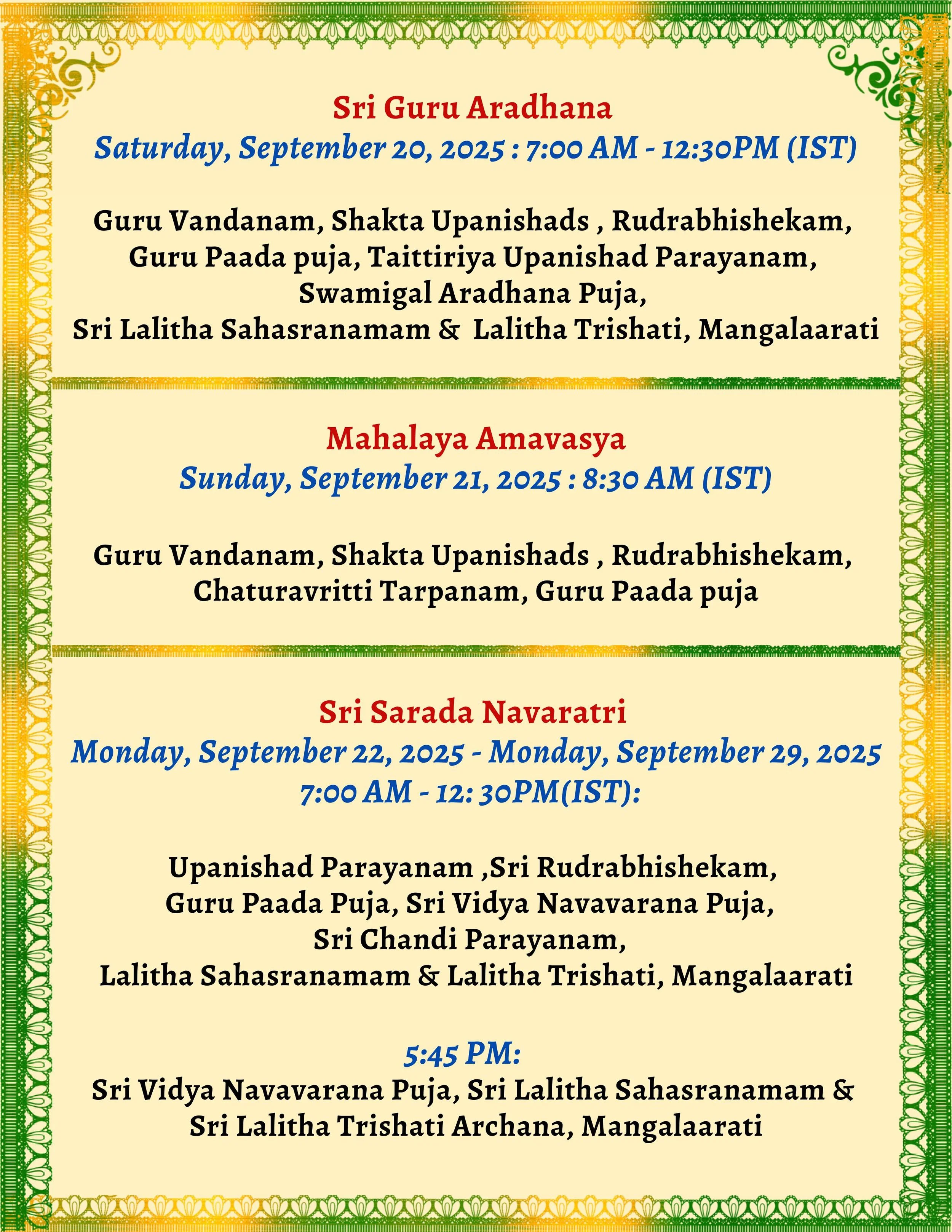 During Navaratri starting Monday, Sept 22, 2025 , Upanishad Parayanam, Sri Rudrabhishekam, Guru Pada Puja, Sri Vidya Navavarana Puja, Sri Chandi Parayanam, Lalitha Sahasranamam & Lalitha Trishati Parayanam and Archana will be performed daily.